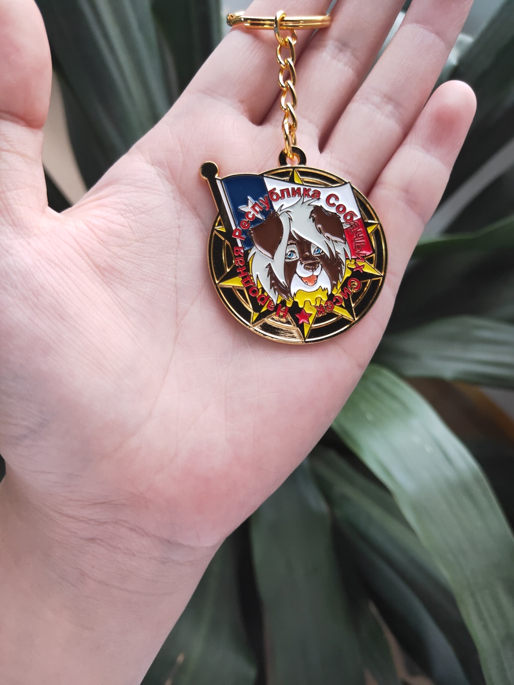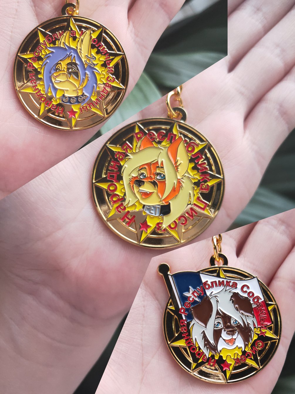 Metal keychain with enamel inlay. Measures 4cm in diameter. Cyrillic translations: "People's Republic of Vixens" "Peoples' Republic of Dogtits" and "Peoples' Republic of Bunny Butts"